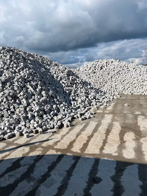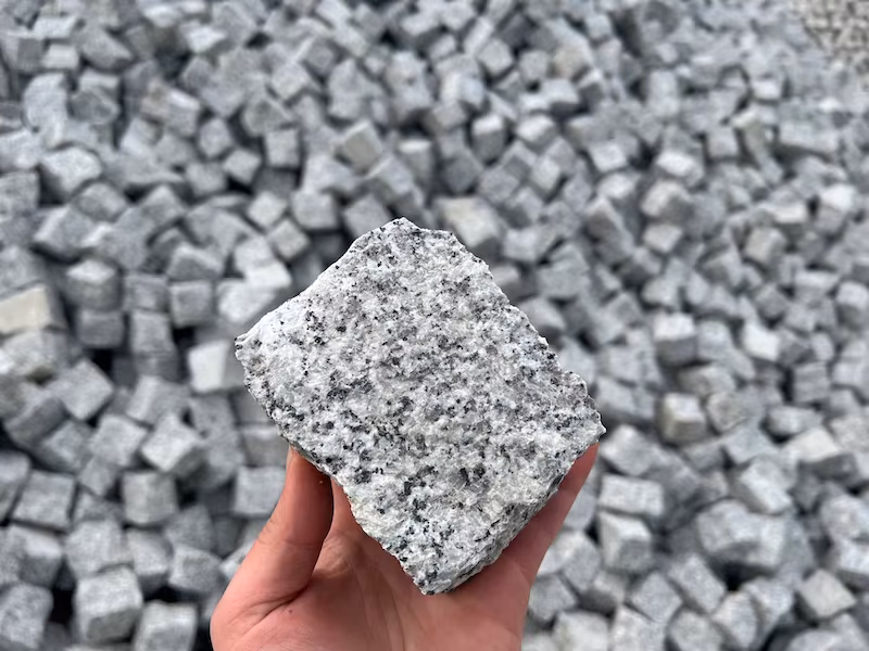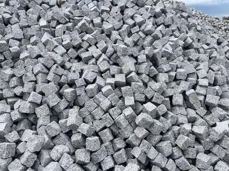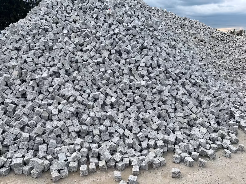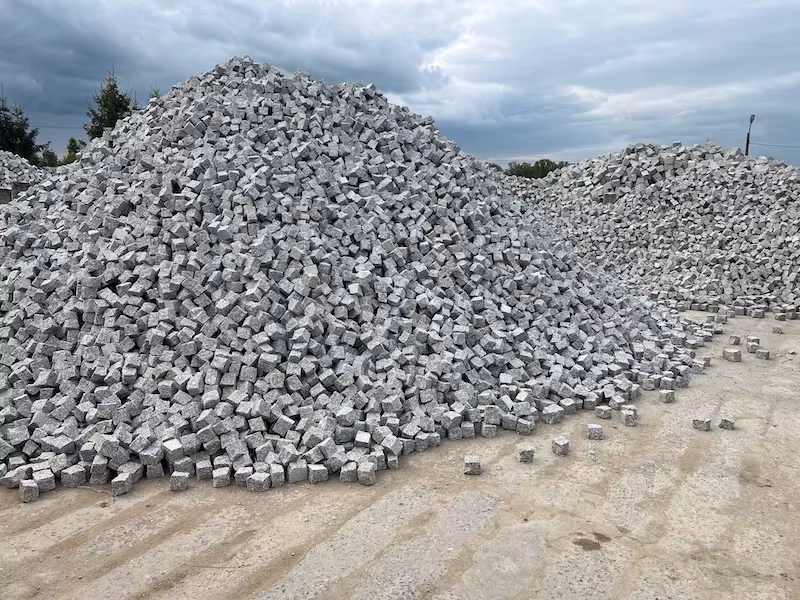 Oferujemy nową kostkę granitową o wymiarach ok. 9 x 11 cm, wykonaną z naturalnego kamienia.